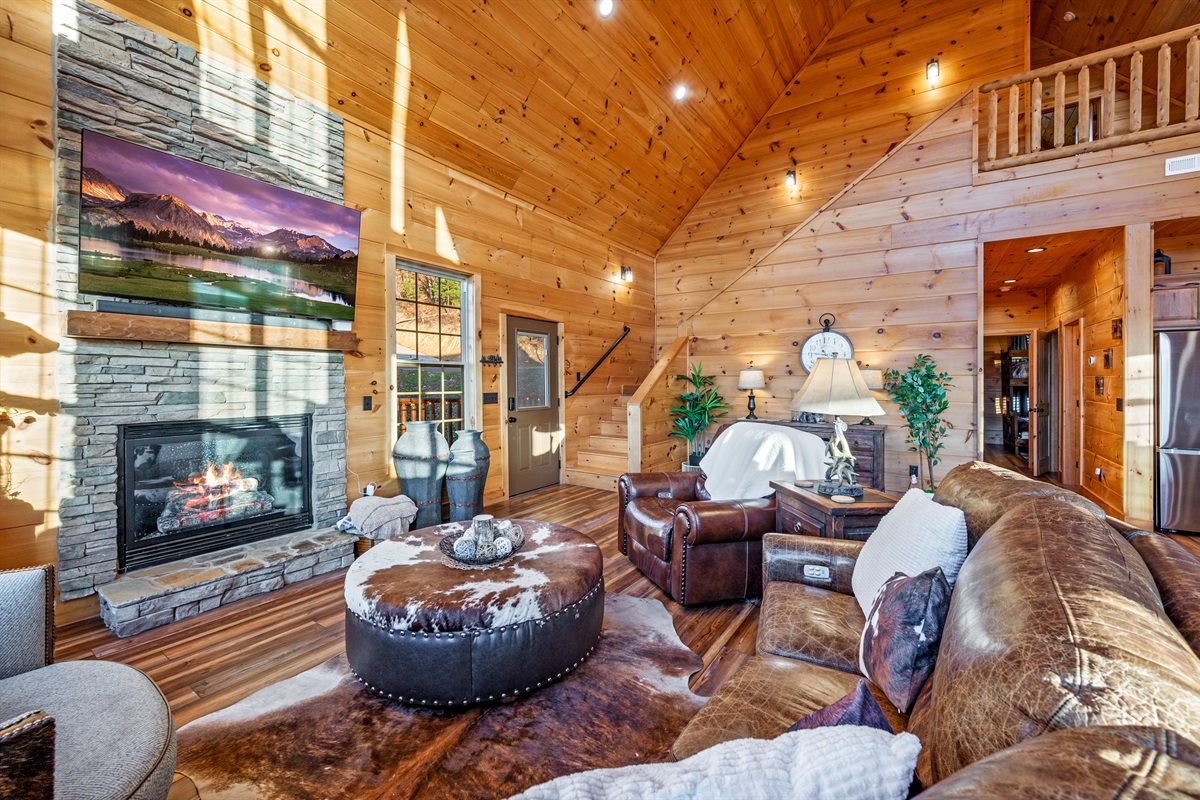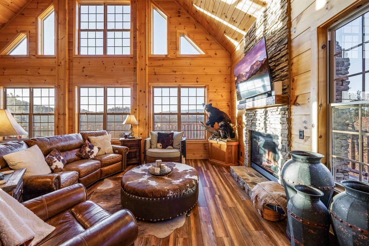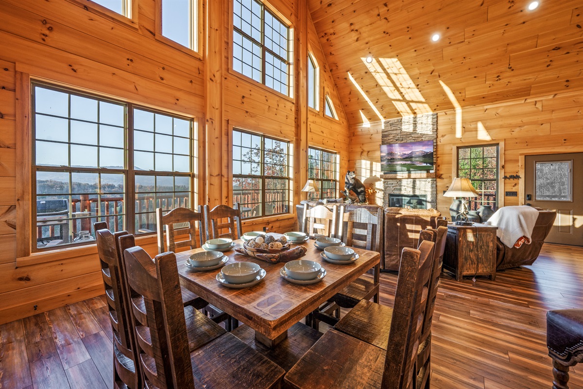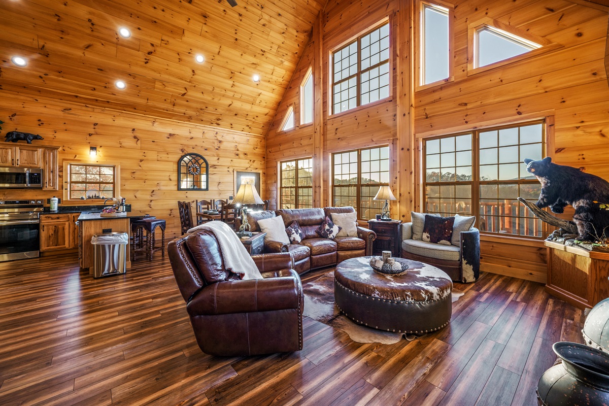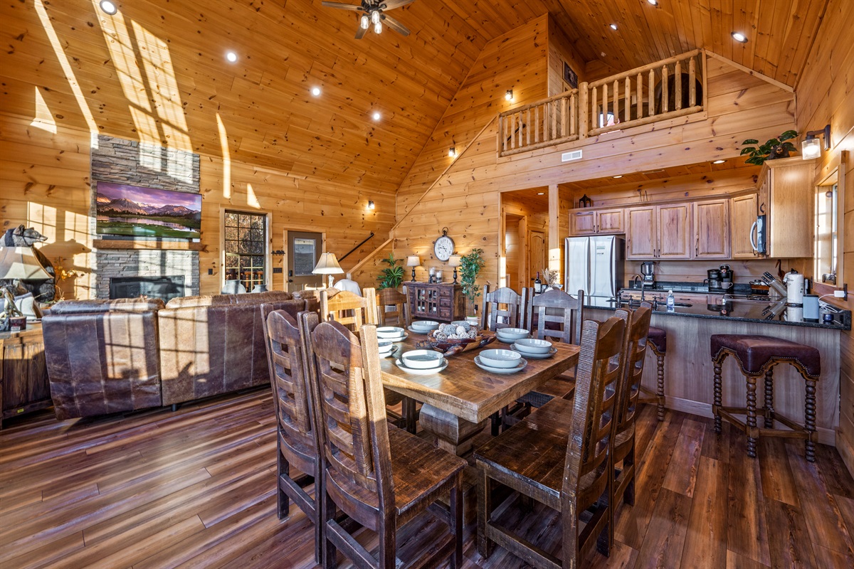 Step inside and be wowed by the open floor plan and floor-to-ceiling windows showcasing panoramic mountain scenery. The great room invites you to sink into plush reclining sofas while the stone fireplace adds cozy charm. Gather at the oversized dining table or cook up a feast in the fully stocked kitchen — perfect for anything from hearty breakfasts to holiday dinners.