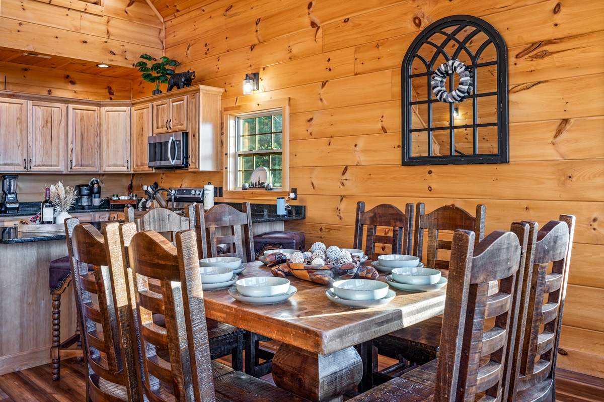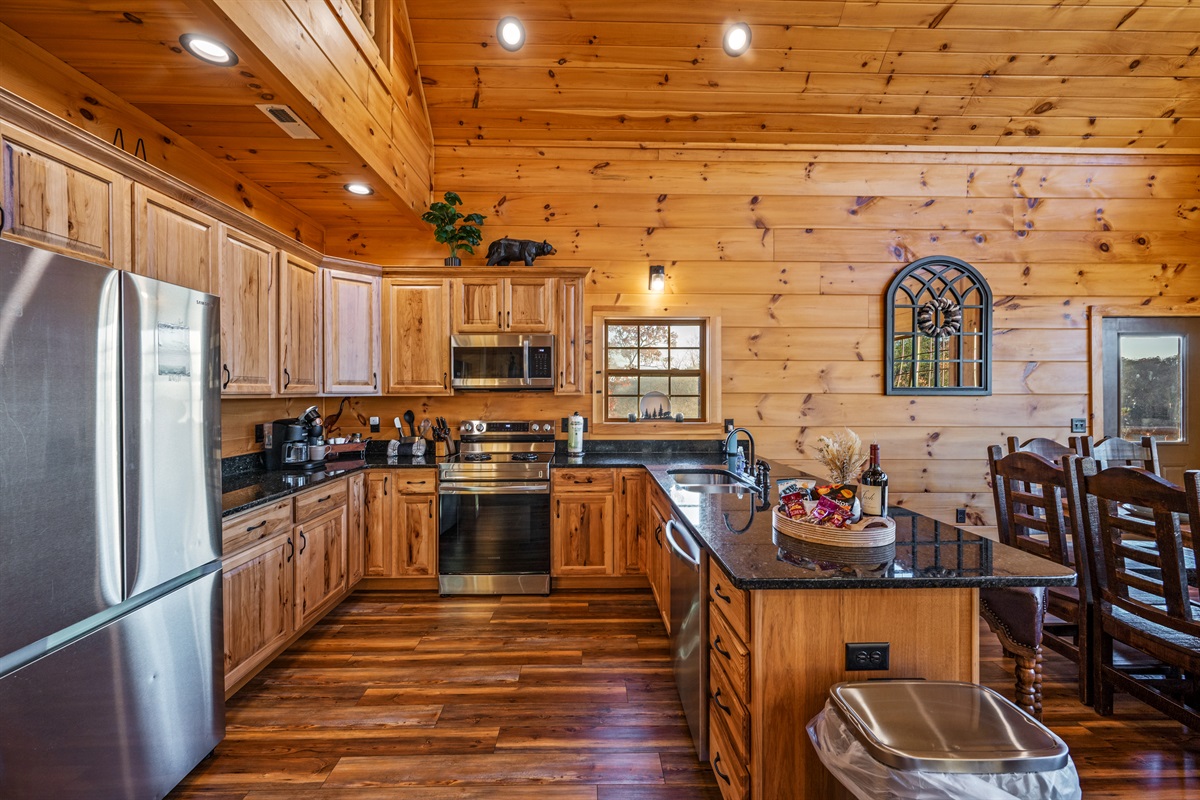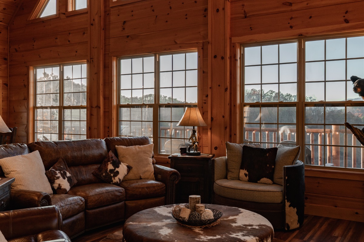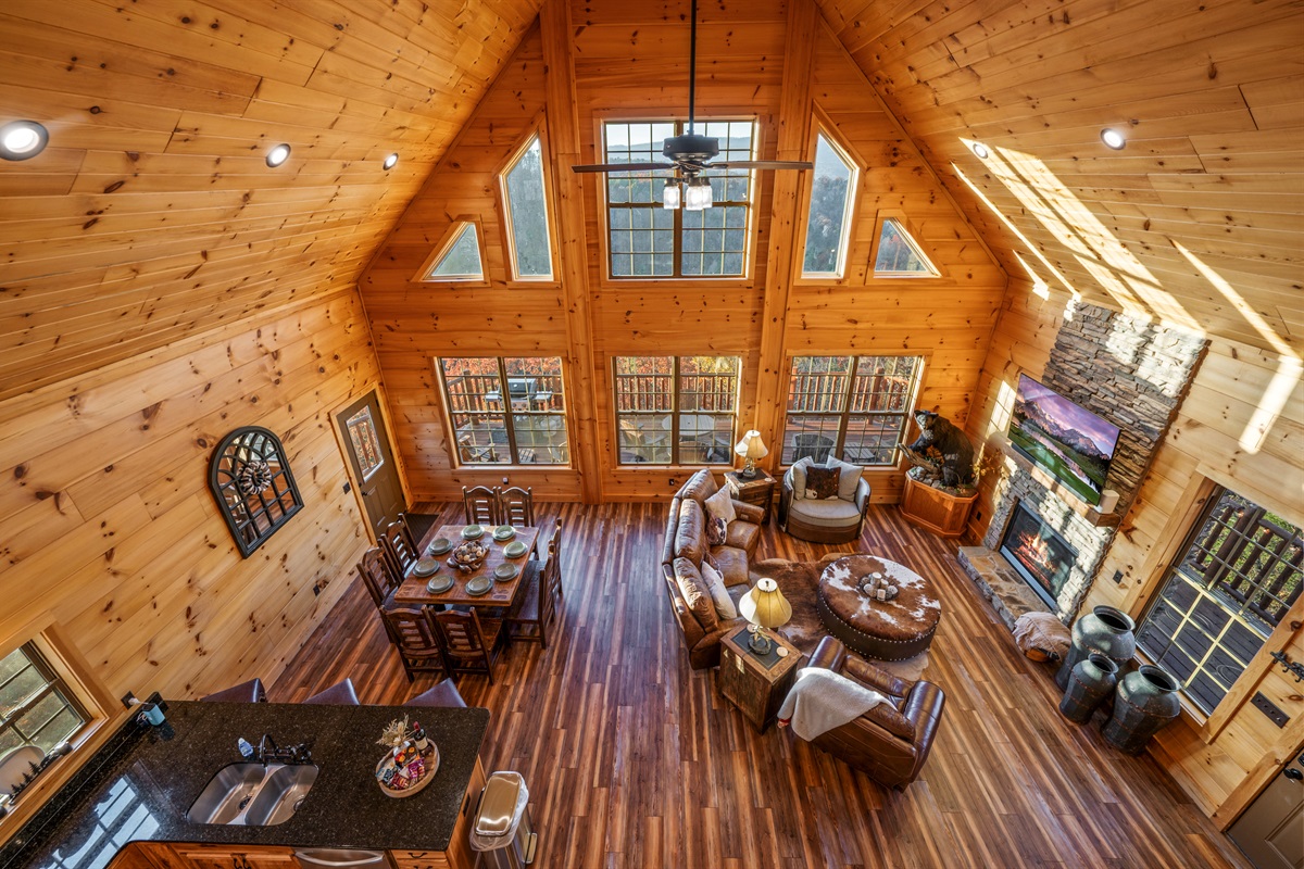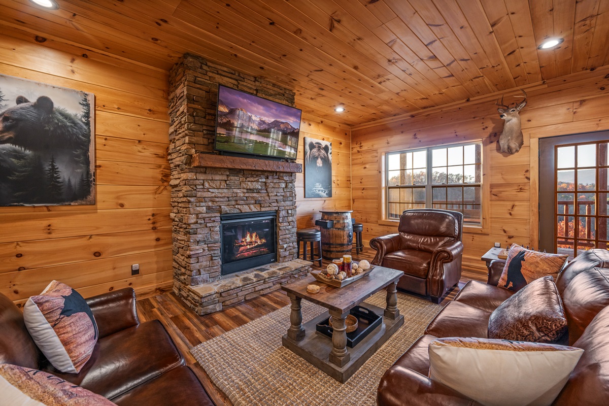 Step inside and be wowed by the open floor plan and floor-to-ceiling windows showcasing panoramic mountain scenery. The great room invites you to sink into plush reclining sofas while the stone fireplace adds cozy charm. Gather at the oversized dining table or cook up a feast in the fully stocked kitchen — perfect for anything from hearty breakfasts to holiday dinners.