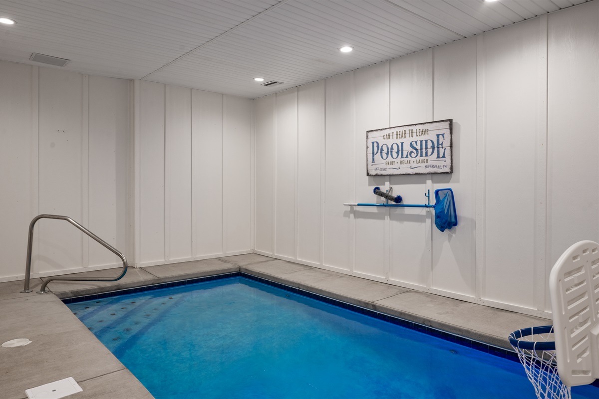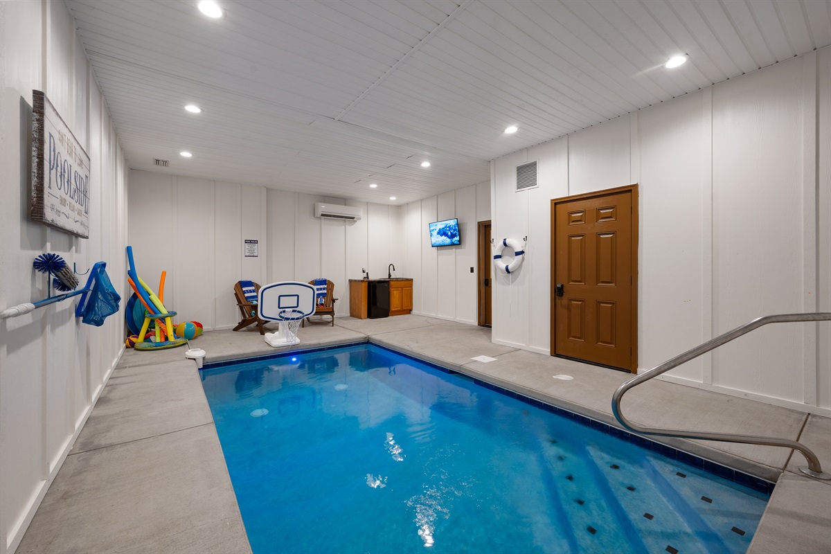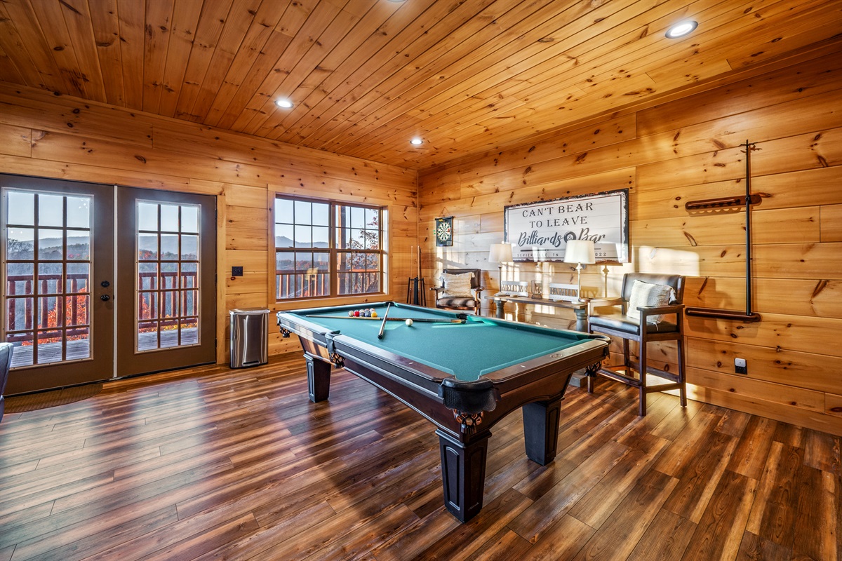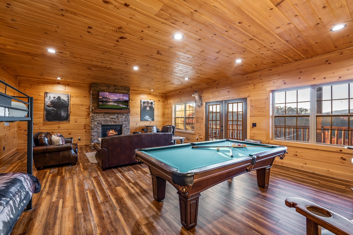 The lower level is a true fun zone — complete with a slate pool table, retro arcade games, and a private indoor heated pool (open year-round!). Step outside to soak in the hot tub while taking in sweeping Smoky Mountain views, or relax on one of the decks as the sun sets.