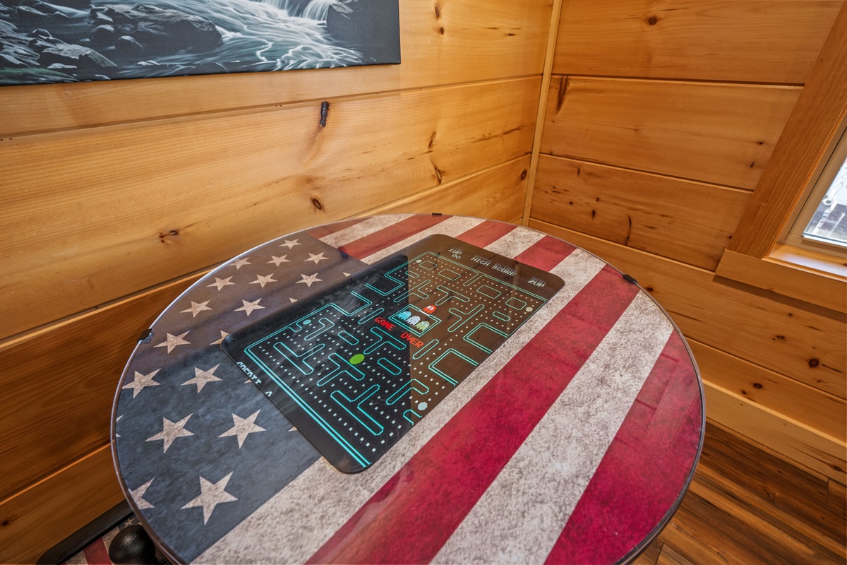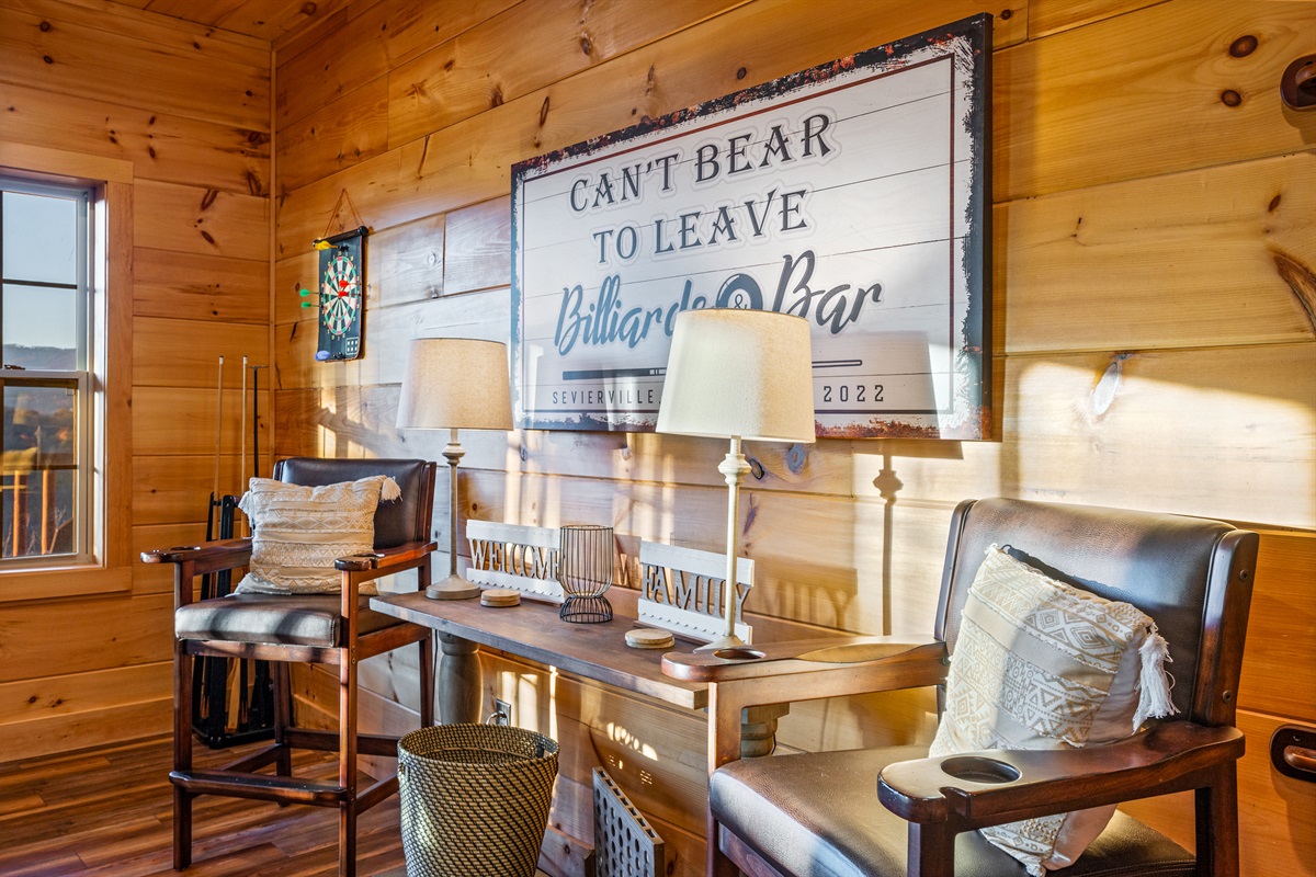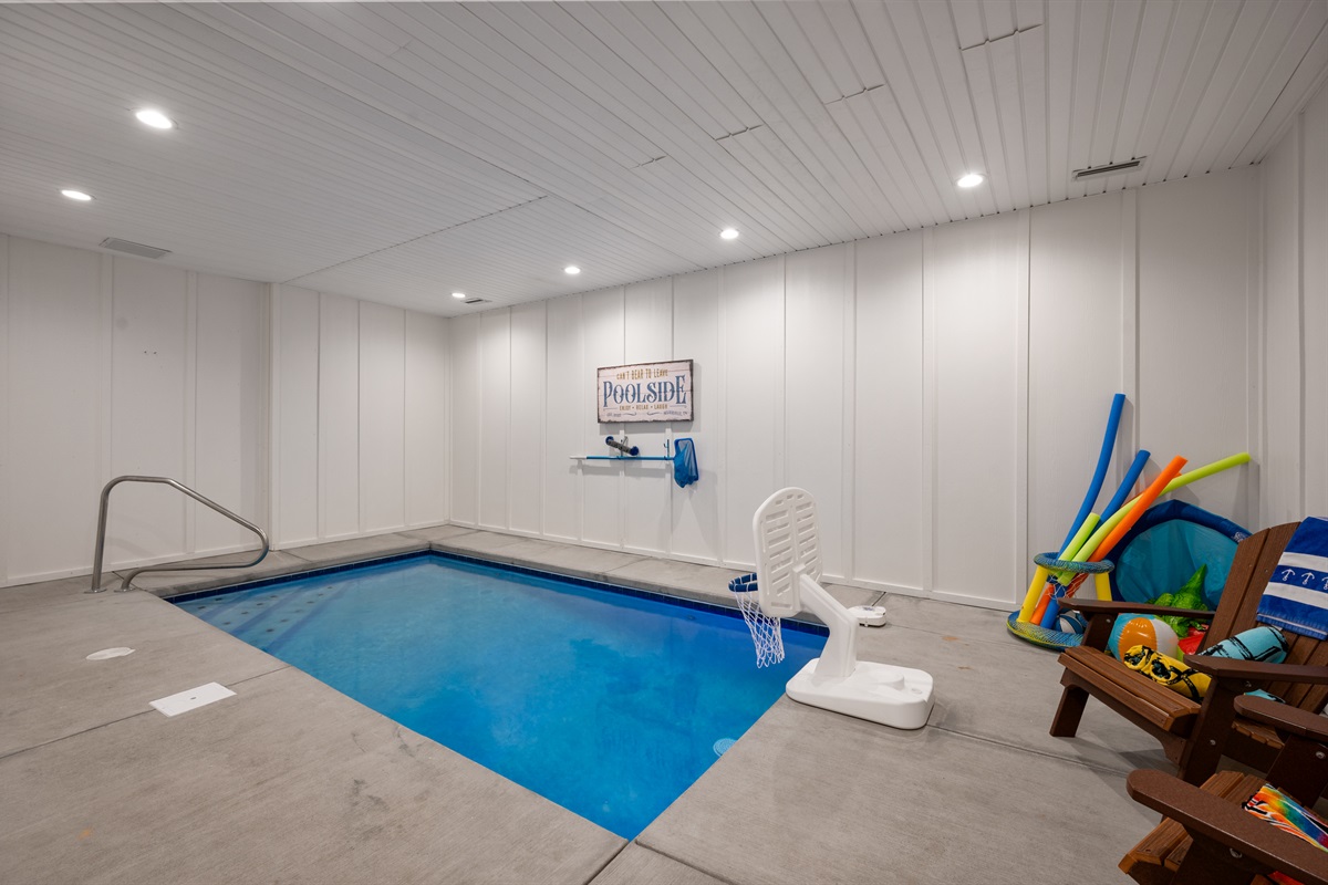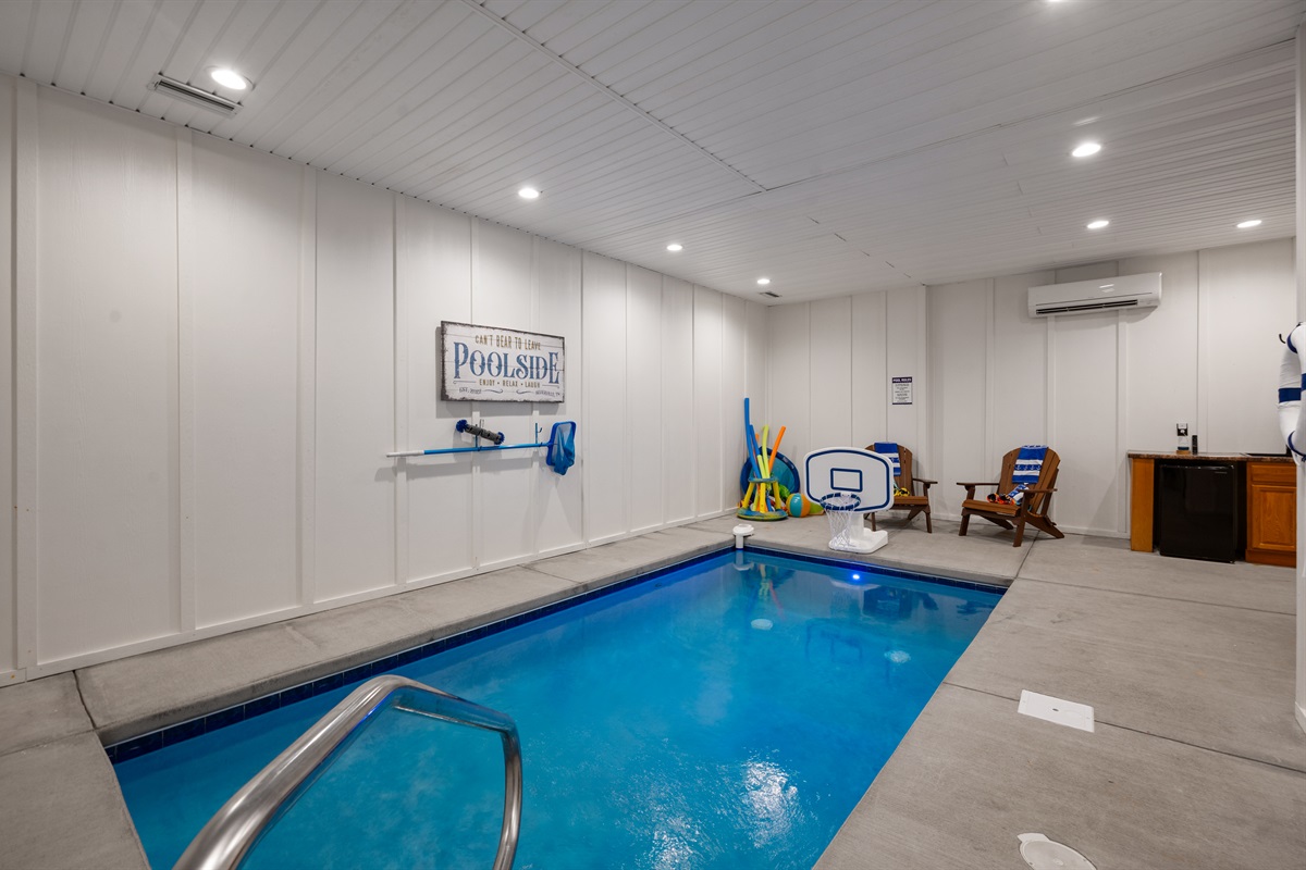The lower level is a true fun zone — complete with a slate pool table, retro arcade games, and a private indoor heated pool (open year-round!). Step outside to soak in the hot tub while taking in sweeping Smoky Mountain views, or relax on one of the decks as the sun sets.