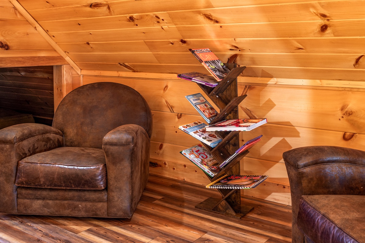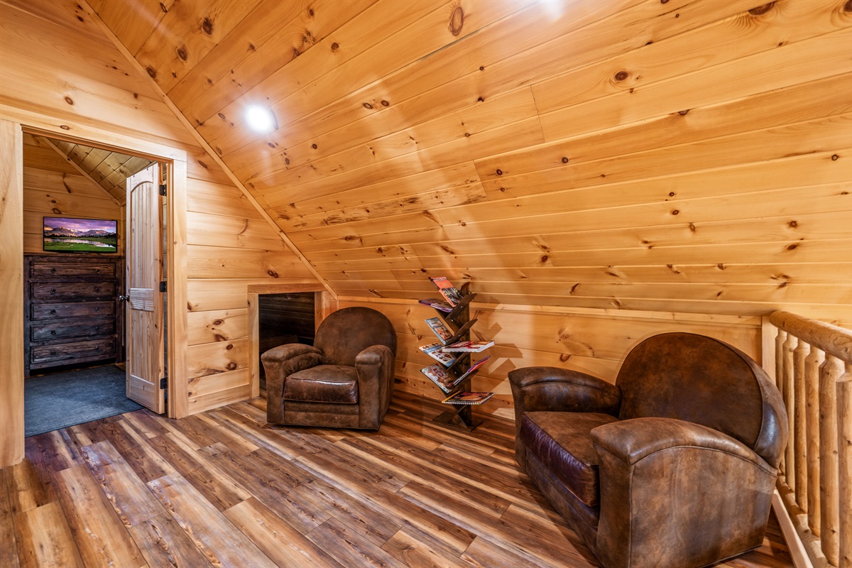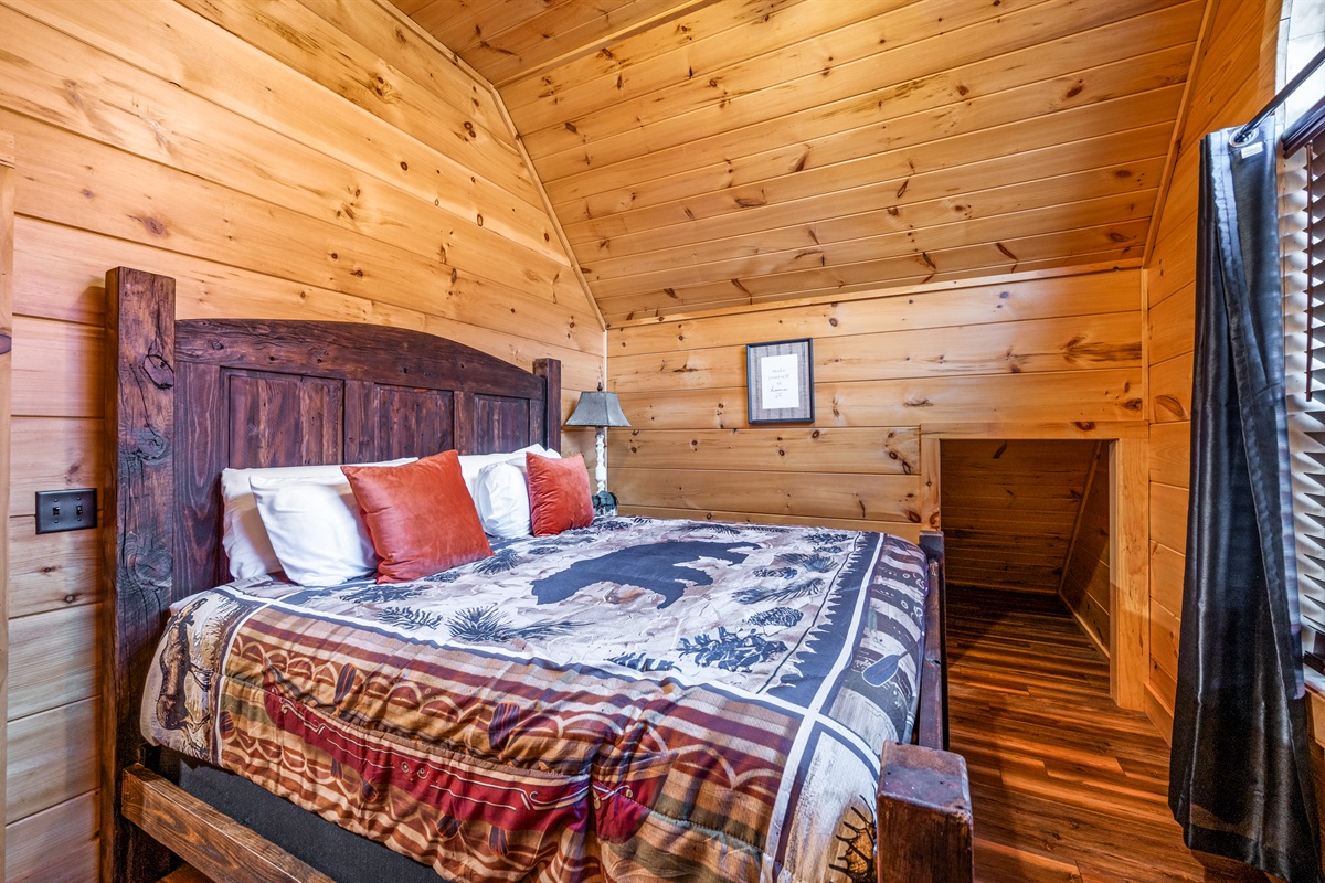 Upper Level: King bedroom with full bath + loft lounge with seating and kids’ play area.