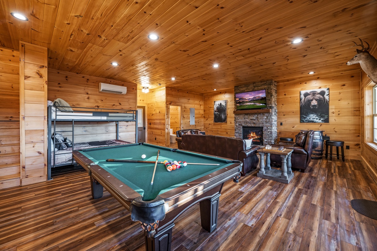 Lower Level: Queen-over-queen bunks (sleeps 4), family room with fireplace, and entertainment area.