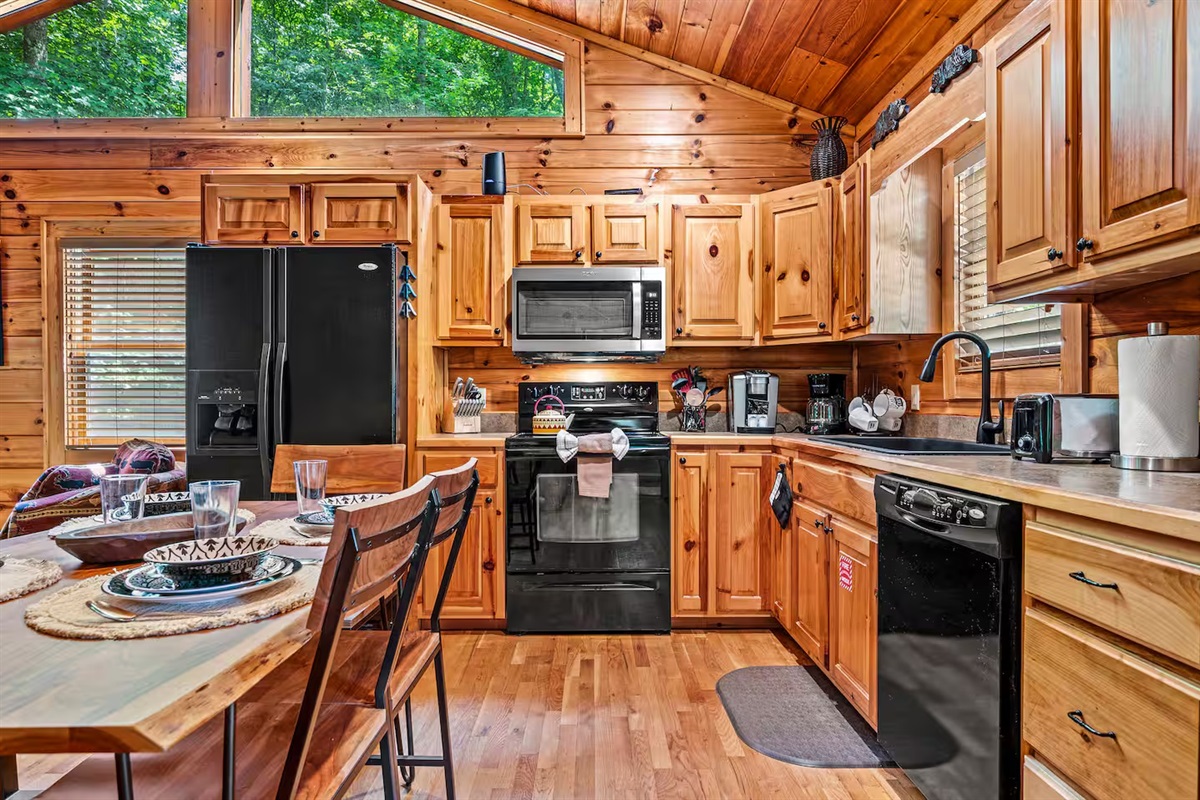 Step into a light-filled living area where a stylish propane fireplace serves as the heart of the home. It is the perfect spot to curl up with a book or gather for a movie night as the evening shadows stretch across the woods. Just steps away, the modern kitchen stands ready for everything from slow morning coffees to elaborate family dinners.