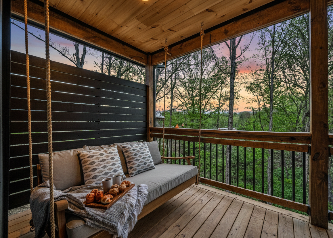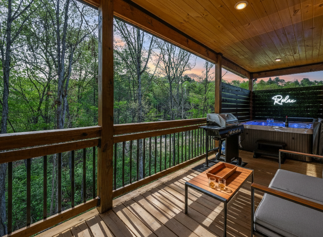 The covered deck offers comfortable seating for up to 7, plus a gas grill for BBQ nights. Guests especially love the porch swing, where you can relax with mountain breezes and a good book. The private hot tub provides the perfect spot for stargazing or unwinding in the evening.
