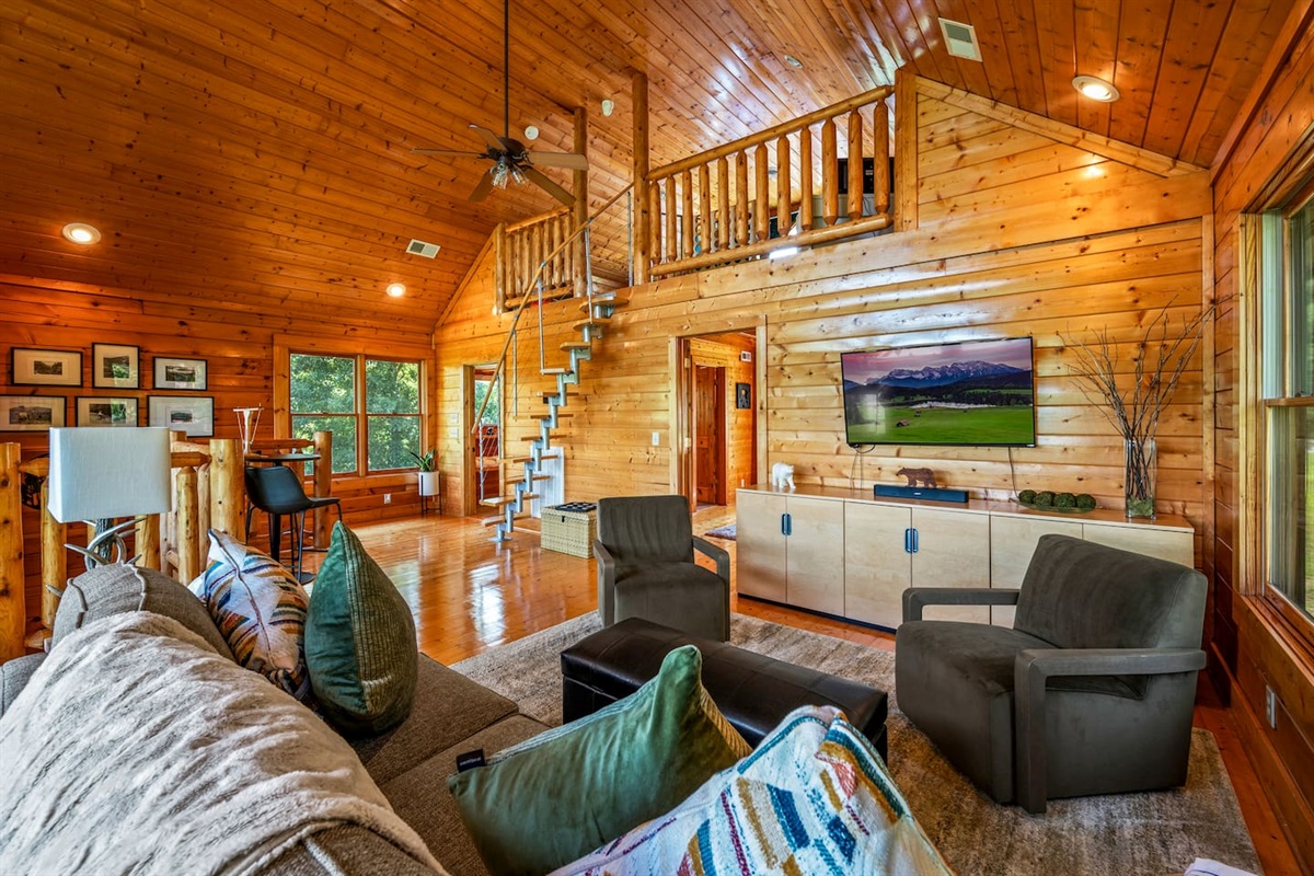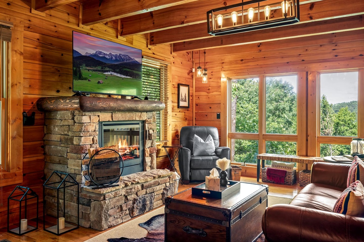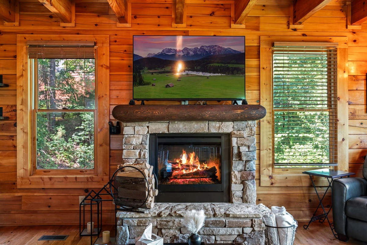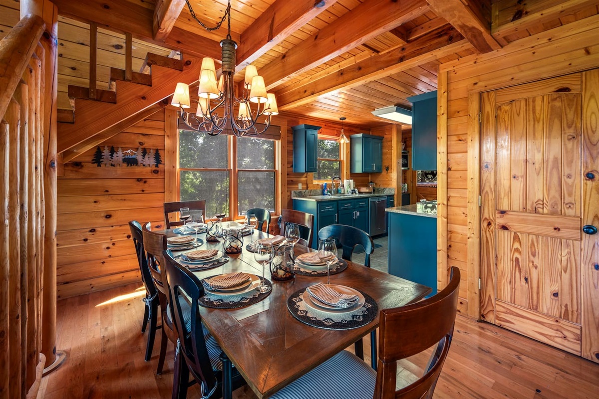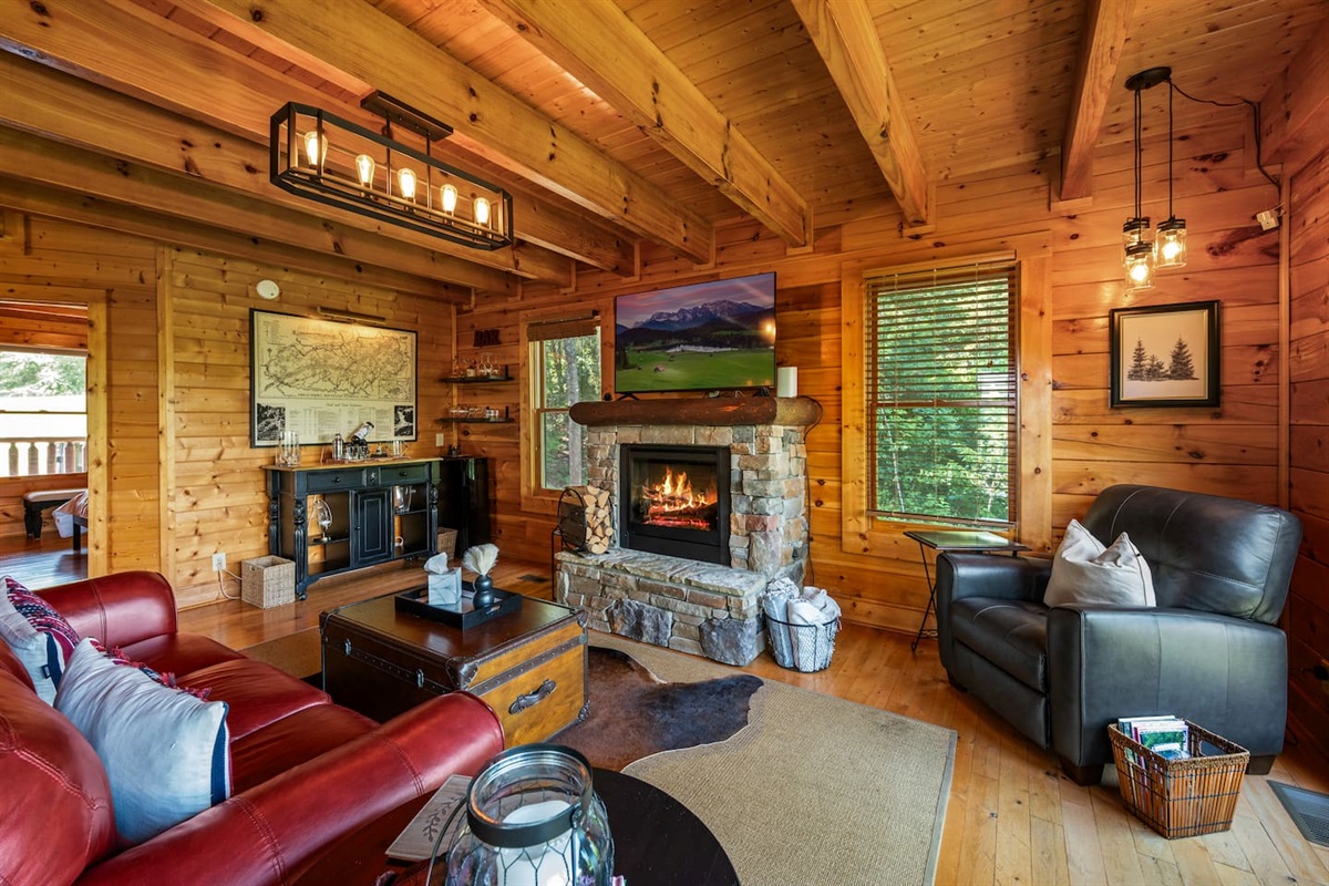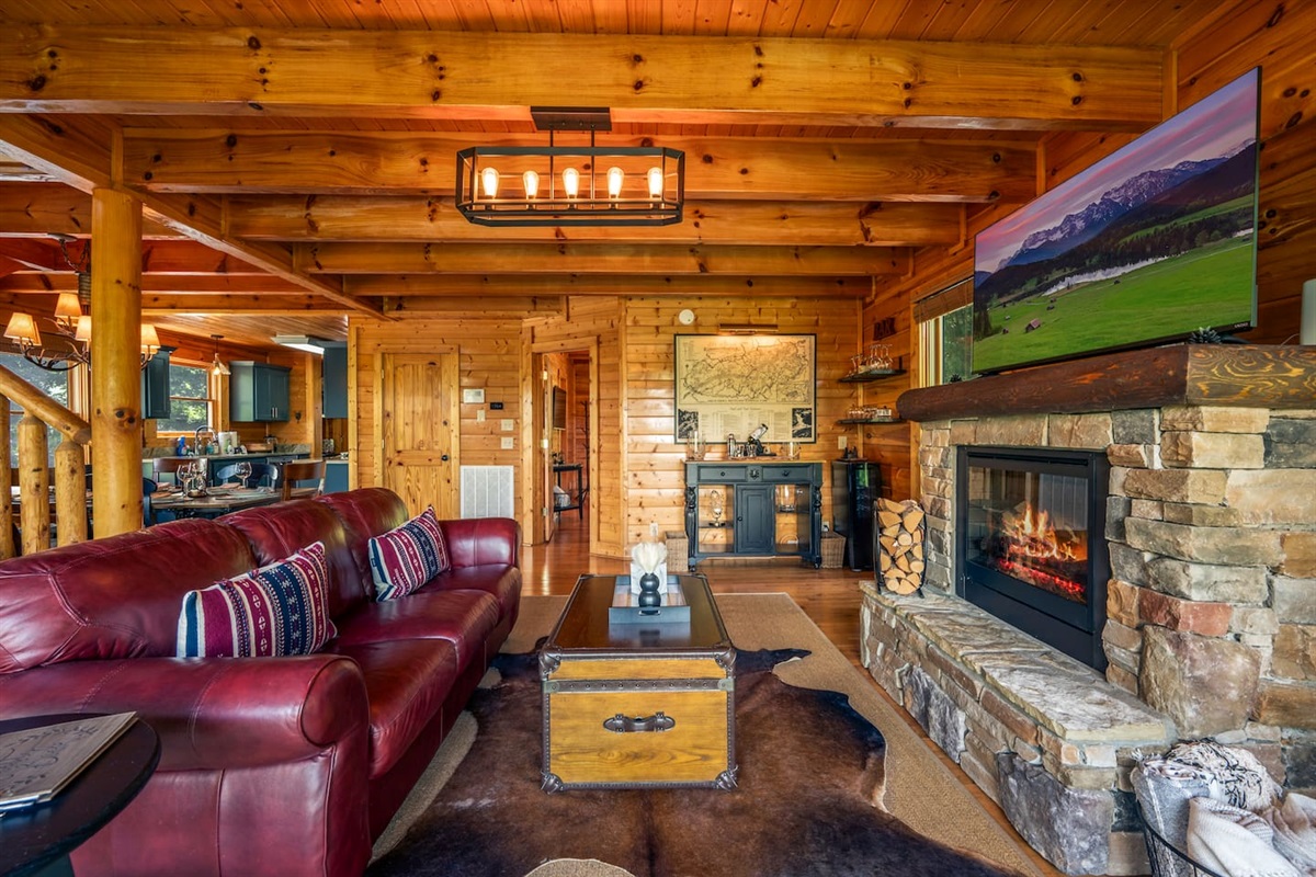 From the moment you arrive, you’ll be impressed by the balance of rustic cabin style and modern upgrades. The open living area features comfortable seating, warm wood interiors, a cozy fireplace, and smart TVs for movie nights or catching up on your favorite shows. Fast WiFi keeps everyone connected, while the fully equipped kitchen makes meal prep a breeze with stainless steel appliances, a full-sized refrigerator, oven, microwave, dishwasher, and even a Nespresso machine.