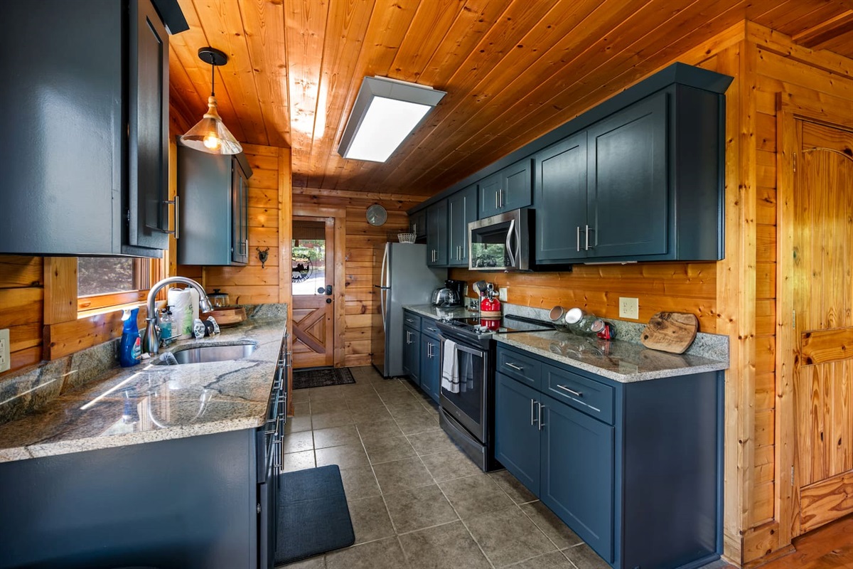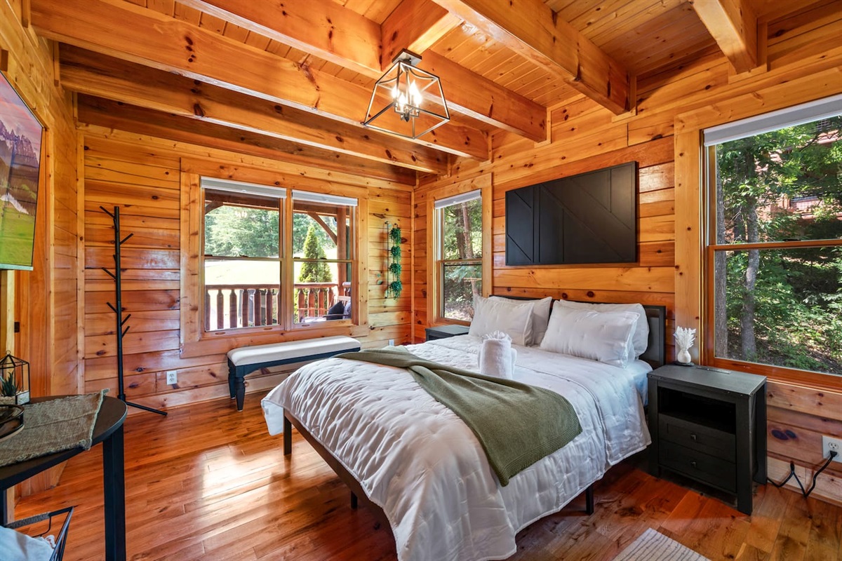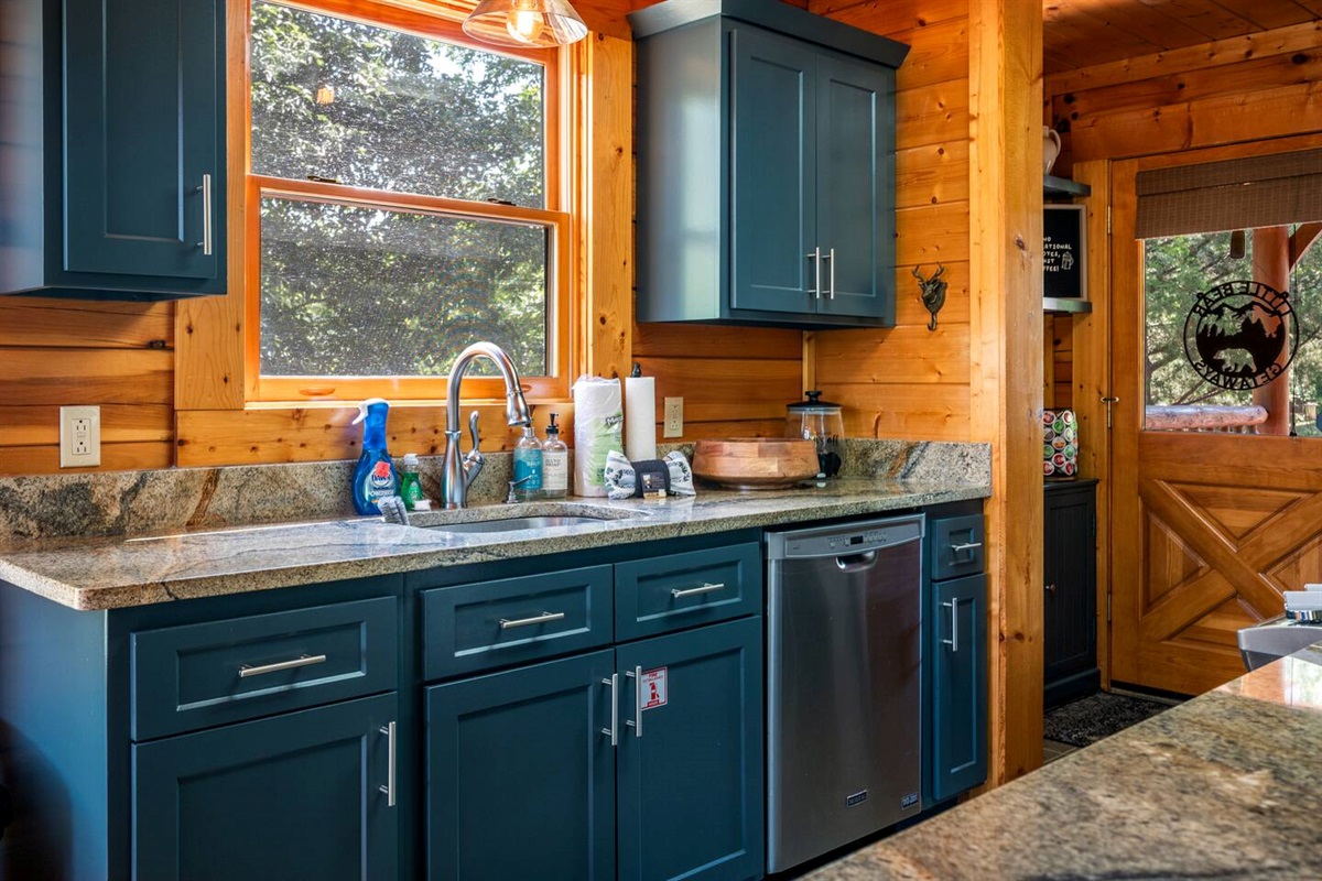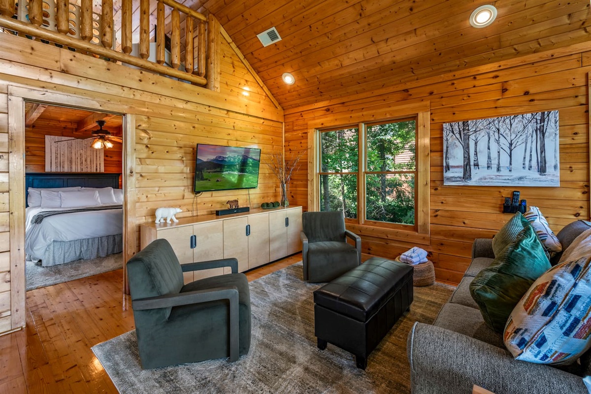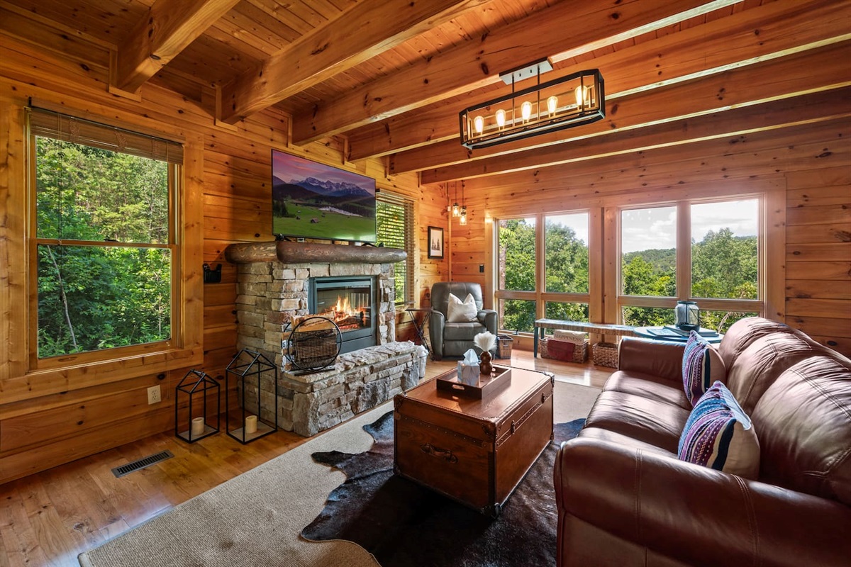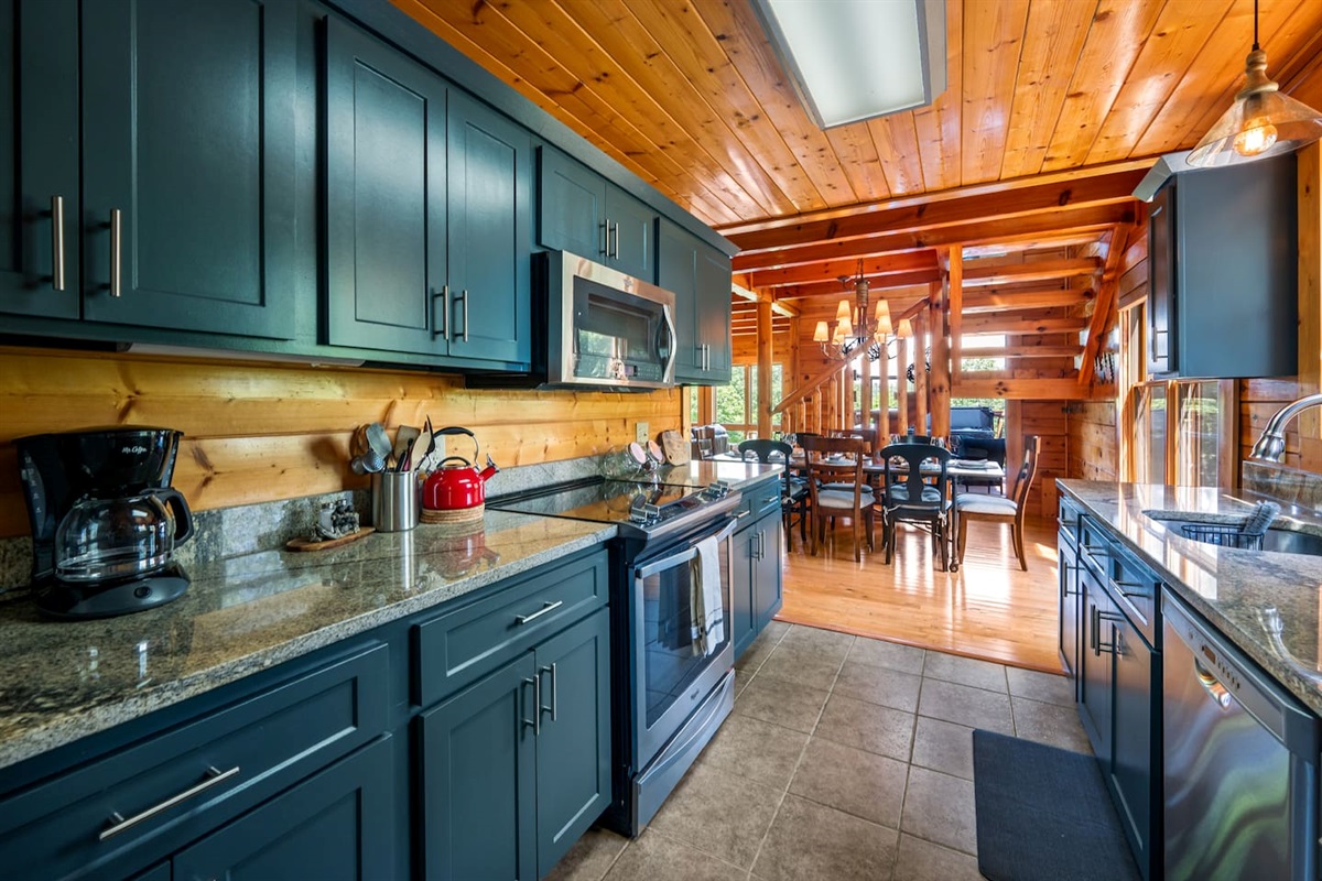 From the moment you arrive, you’ll be impressed by the balance of rustic cabin style and modern upgrades. The open living area features comfortable seating, warm wood interiors, a cozy fireplace, and smart TVs for movie nights or catching up on your favorite shows. Fast WiFi keeps everyone connected, while the fully equipped kitchen makes meal prep a breeze with stainless steel appliances, a full-sized refrigerator, oven, microwave, dishwasher, and even a Nespresso machine.