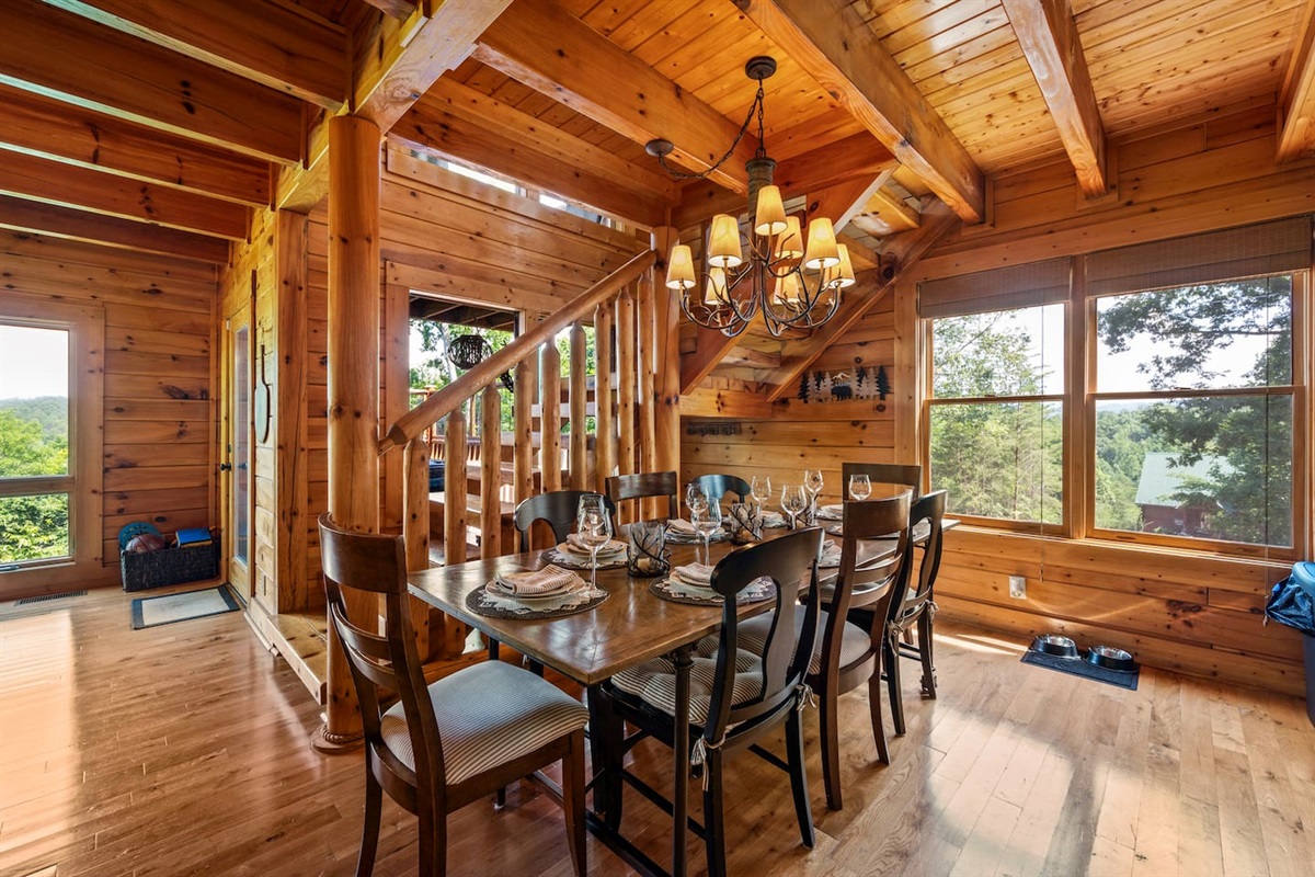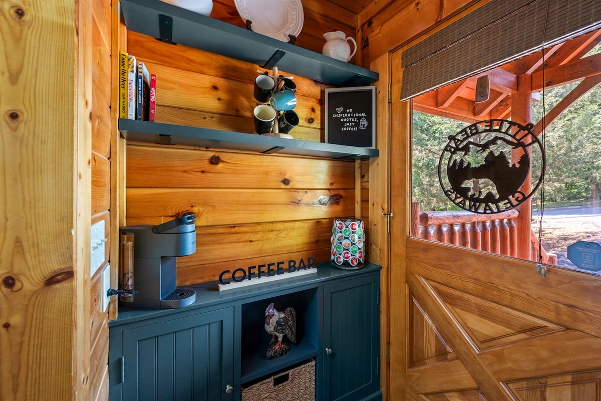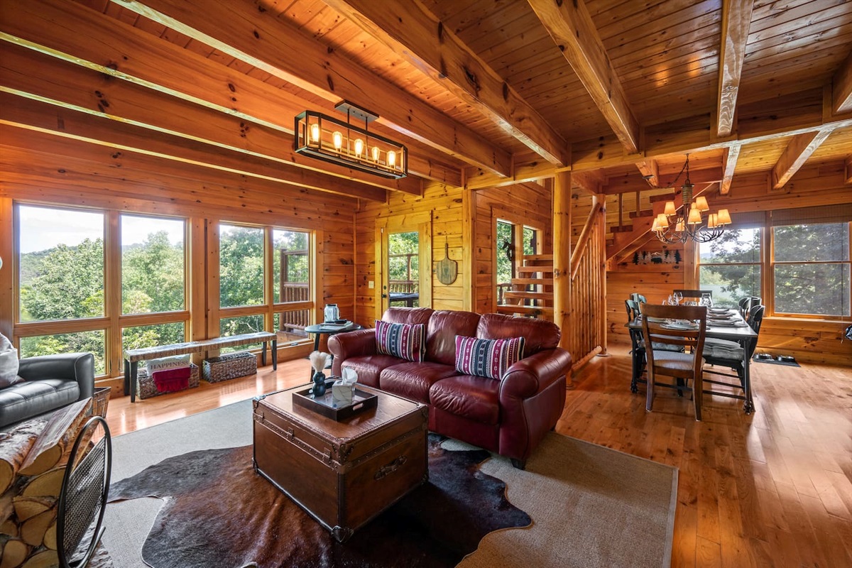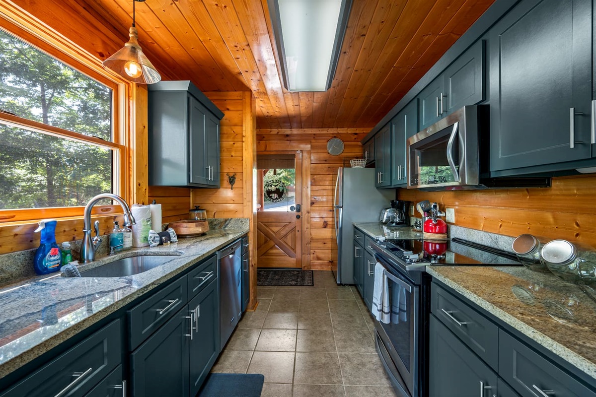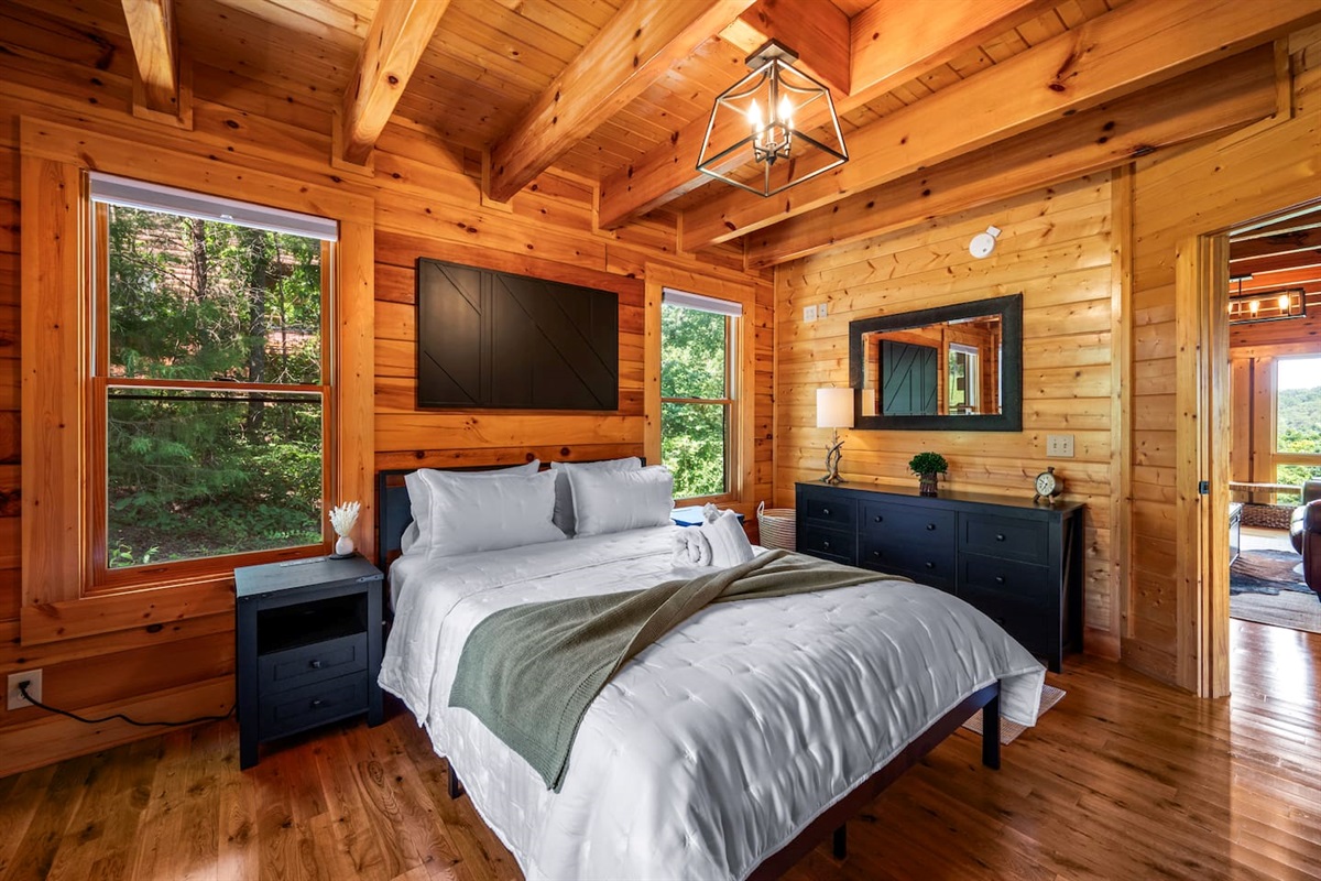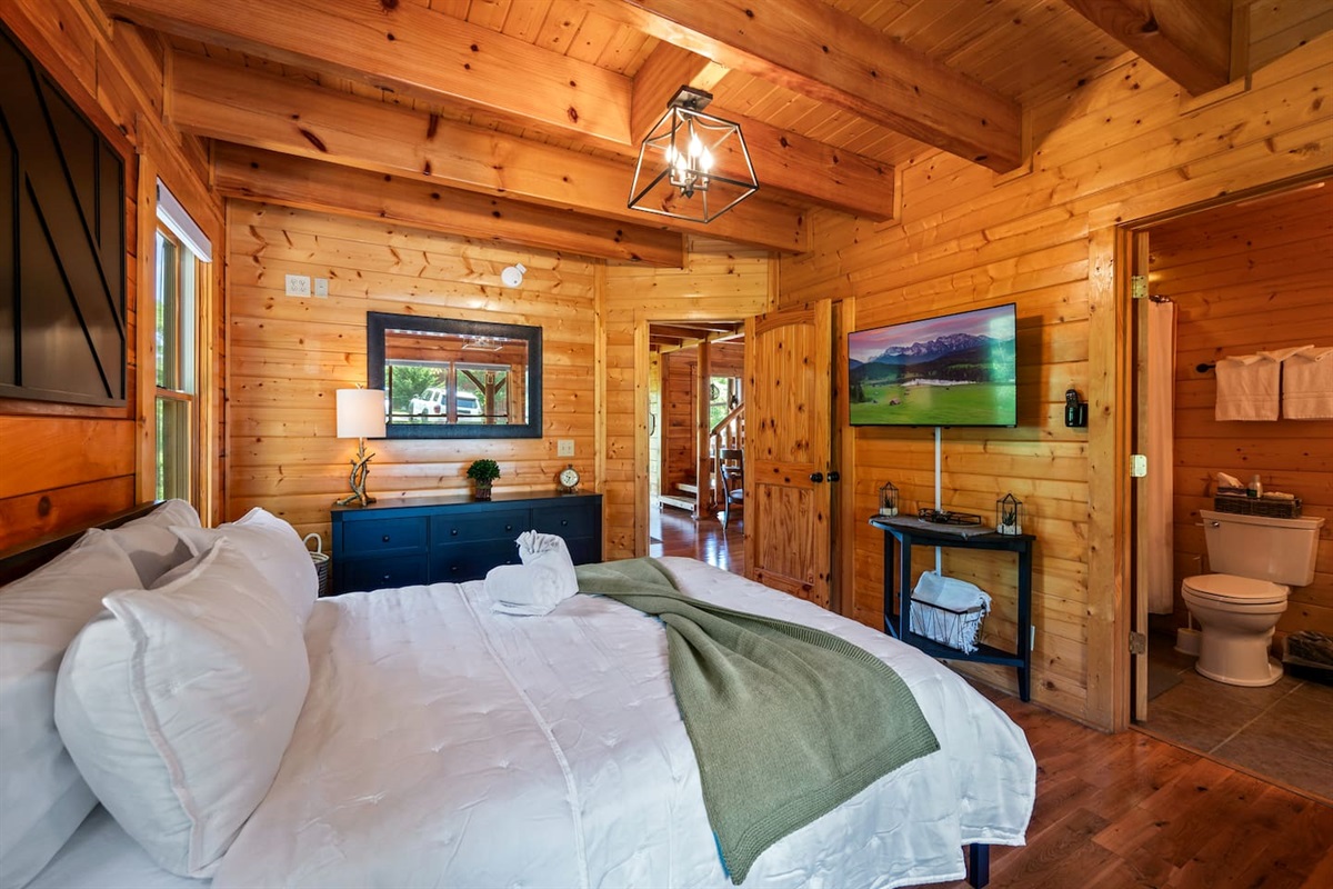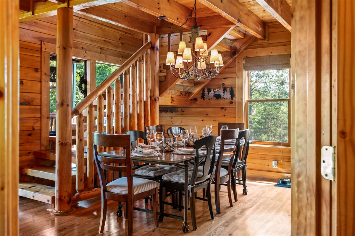 From the moment you arrive, you’ll be impressed by the balance of rustic cabin style and modern upgrades. The open living area features comfortable seating, warm wood interiors, a cozy fireplace, and smart TVs for movie nights or catching up on your favorite shows. Fast WiFi keeps everyone connected, while the fully equipped kitchen makes meal prep a breeze with stainless steel appliances, a full-sized refrigerator, oven, microwave, dishwasher, and even a Nespresso machine.