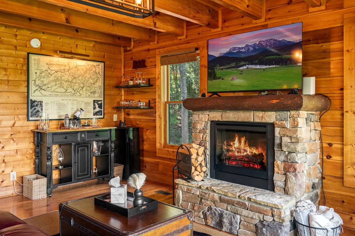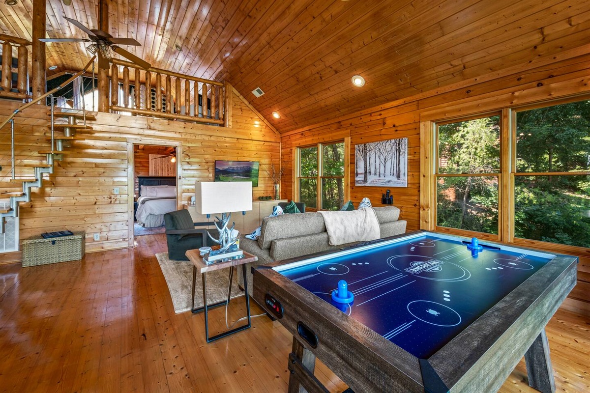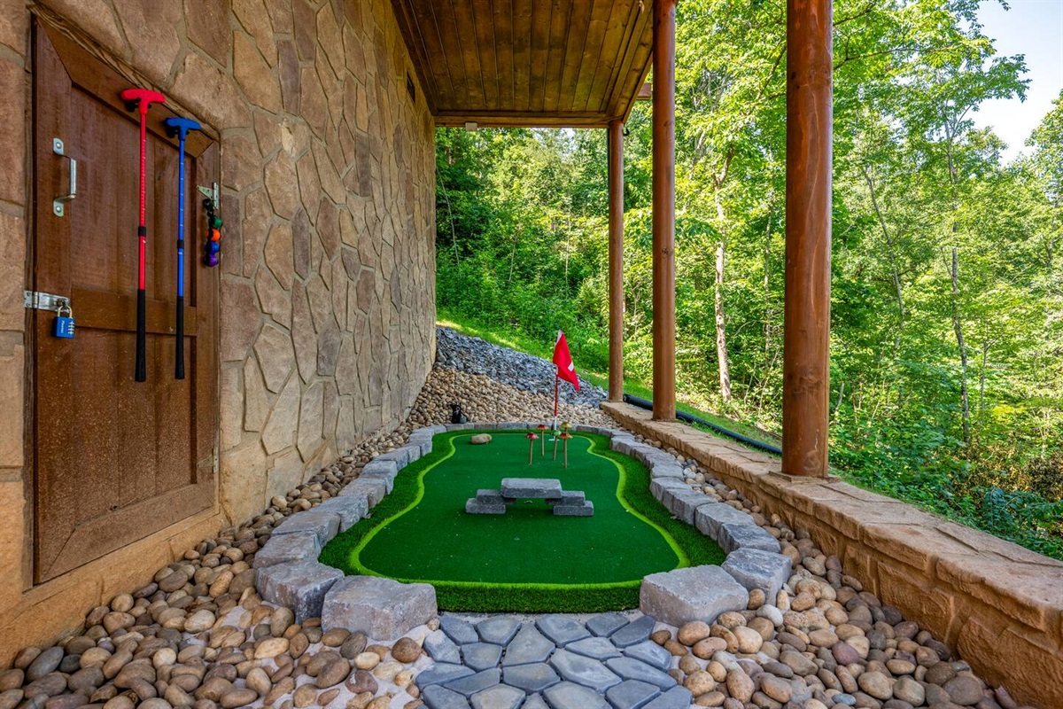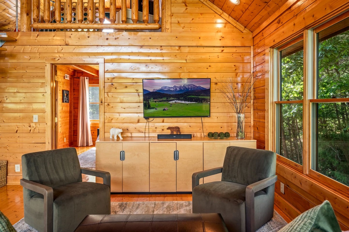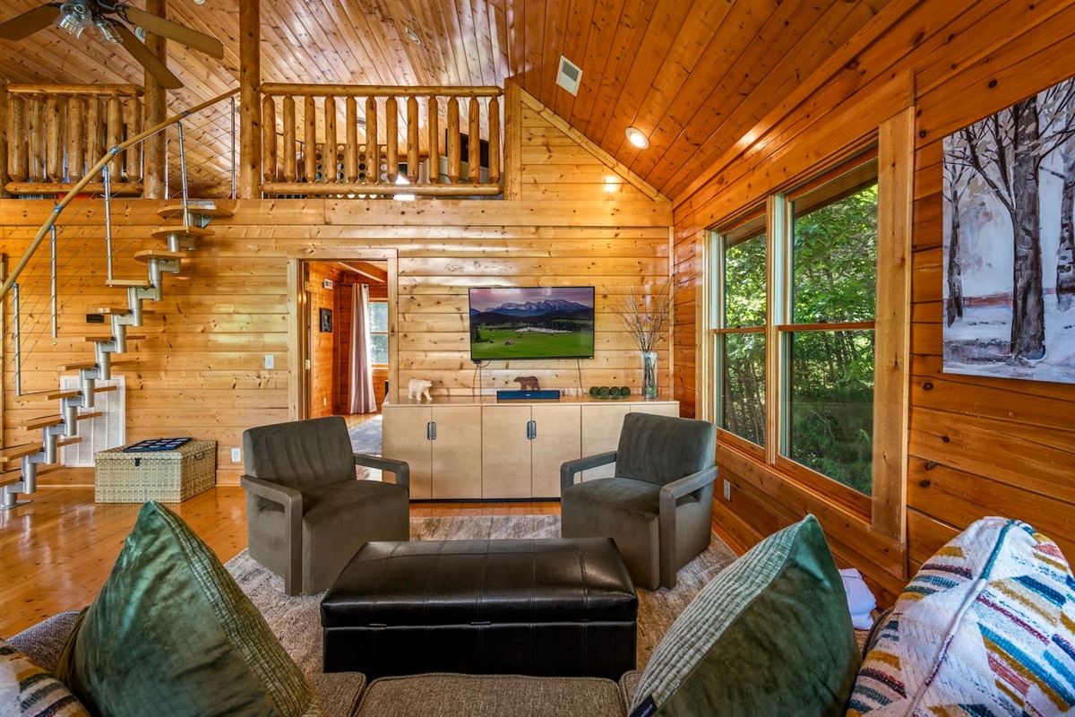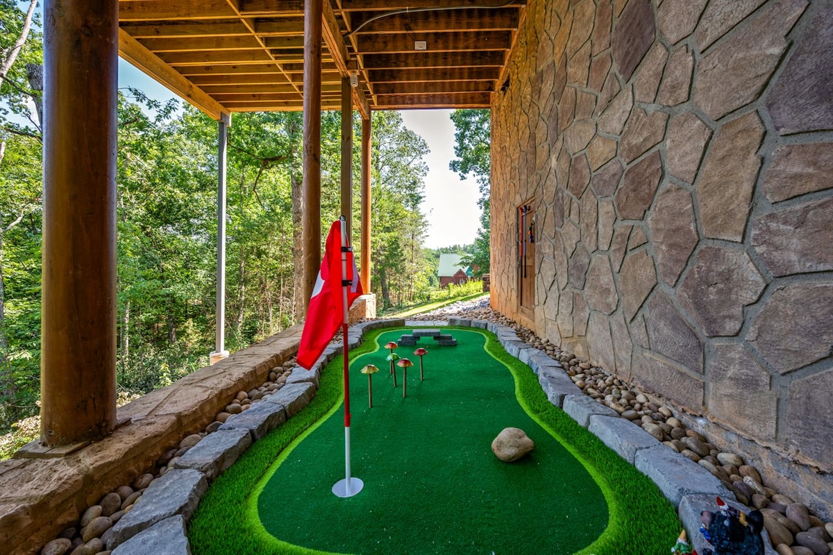 One of the highlights of Little Bear Getaway is the private custom putt-putt course located right in your yard. Families love challenging each other to mini-golf tournaments without ever leaving the cabin. When the sun sets, gather around the outdoor fire pit for s’mores, laughter, and stargazing. A private hot tub with wooded and mountain views adds the perfect touch of relaxation after a day of adventure.