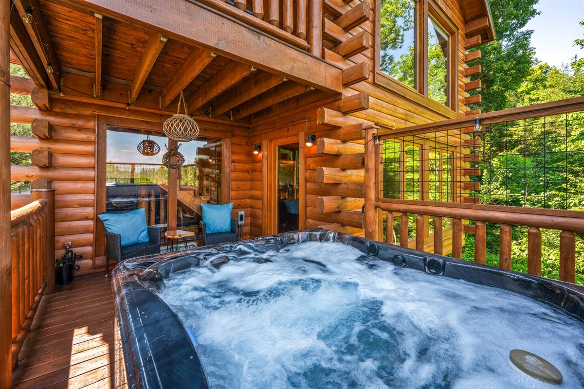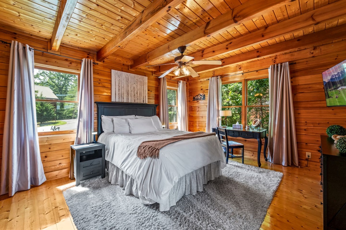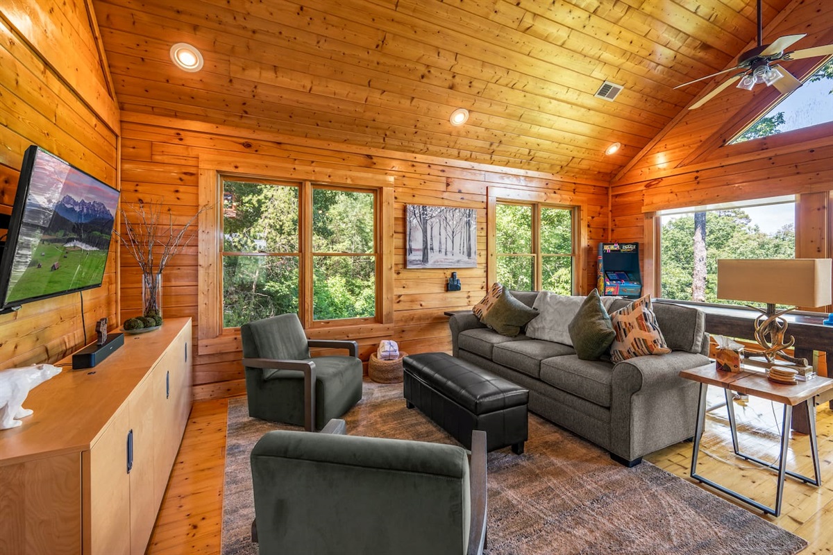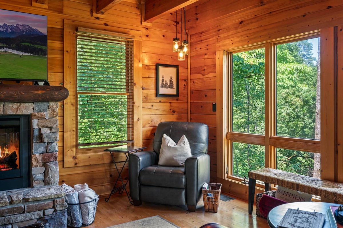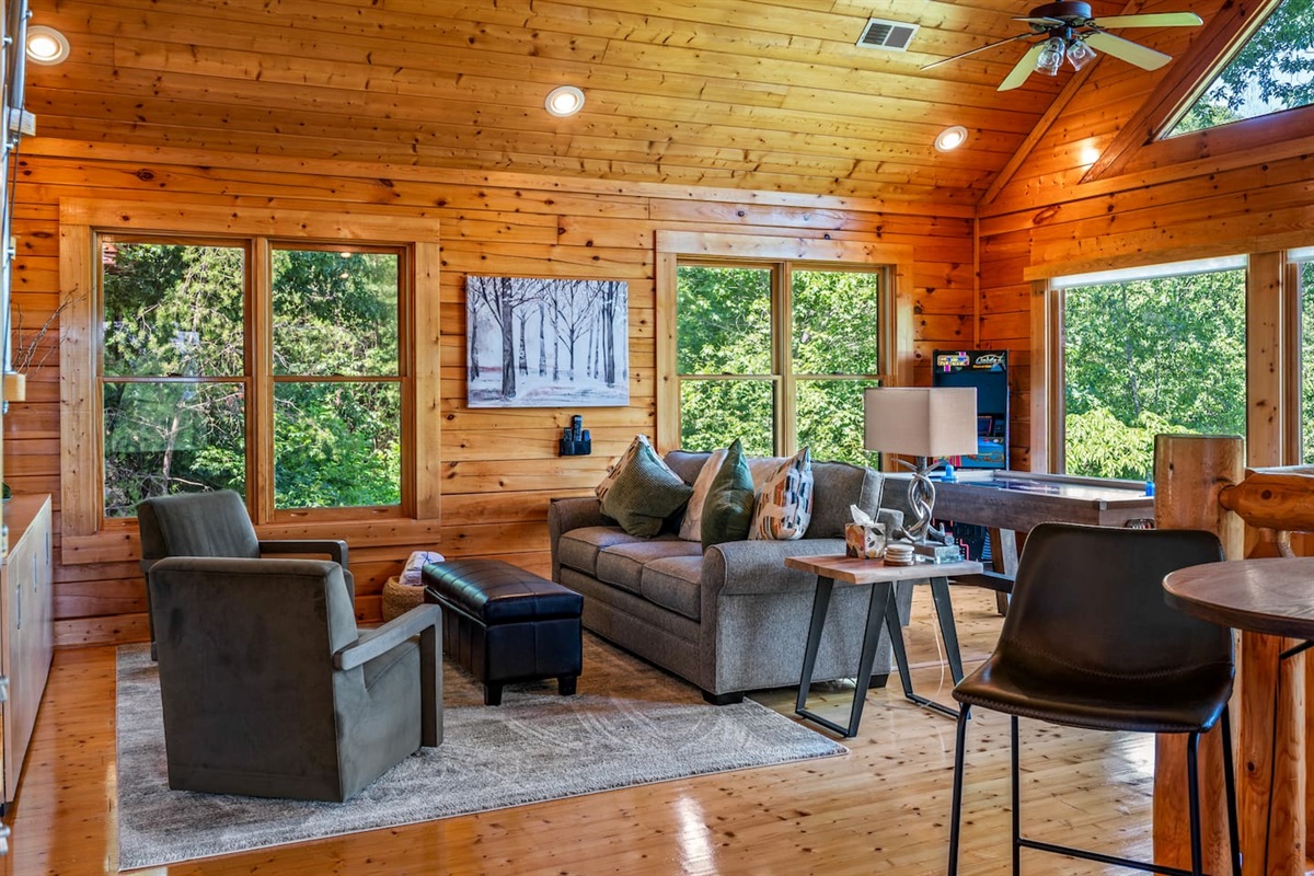 One of the highlights of Little Bear Getaway is the private custom putt-putt course located right in your yard. Families love challenging each other to mini-golf tournaments without ever leaving the cabin. When the sun sets, gather around the outdoor fire pit for s’mores, laughter, and stargazing. A private hot tub with wooded and mountain views adds the perfect touch of relaxation after a day of adventure.