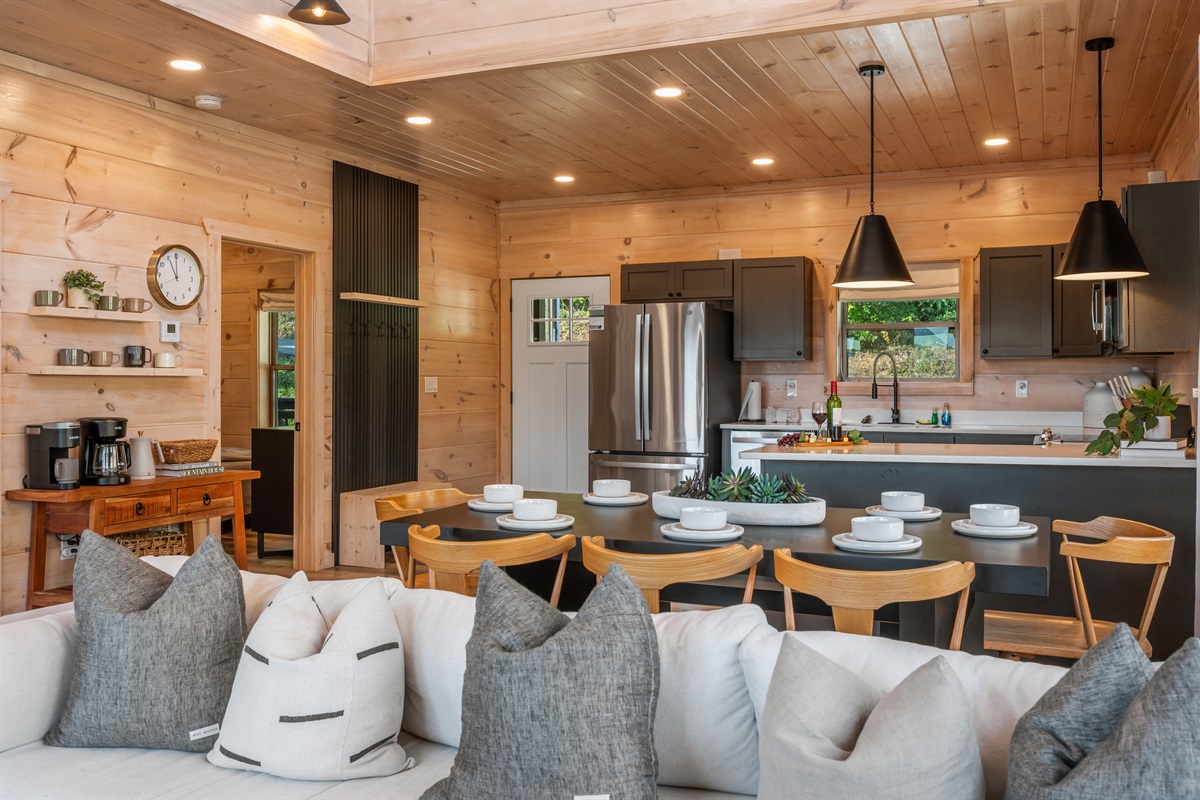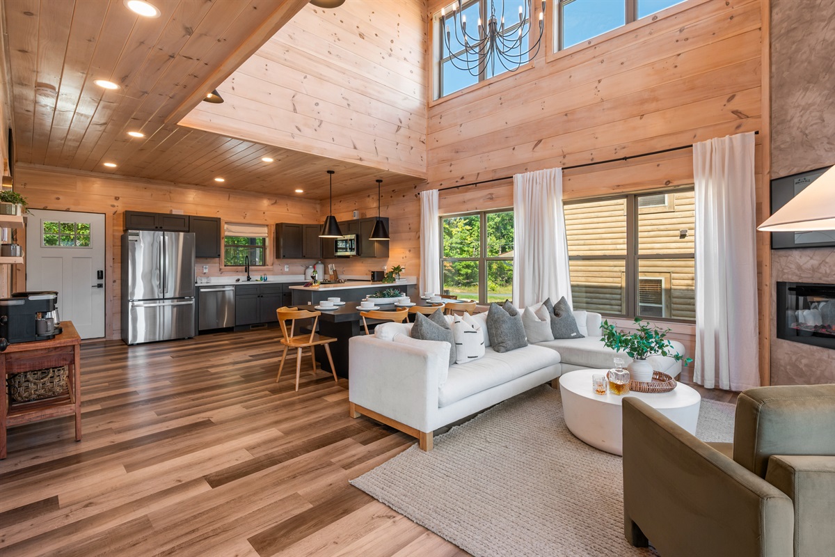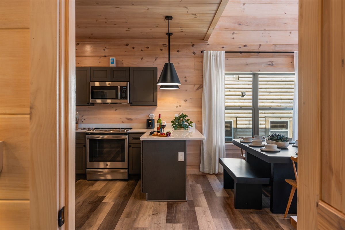From the moment you step inside, you’ll notice the attention to detail. The open-concept living area features vaulted ceilings, rich wood finishes, and large windows that showcase the natural beauty surrounding the cabin. Relax on comfortable seating while enjoying the warmth of the fireplace, or catch up on your favorite shows with the smart TV. The fully stocked kitchen makes mealtime a breeze, whether you’re whipping up quick snacks or preparing a full family dinner.
